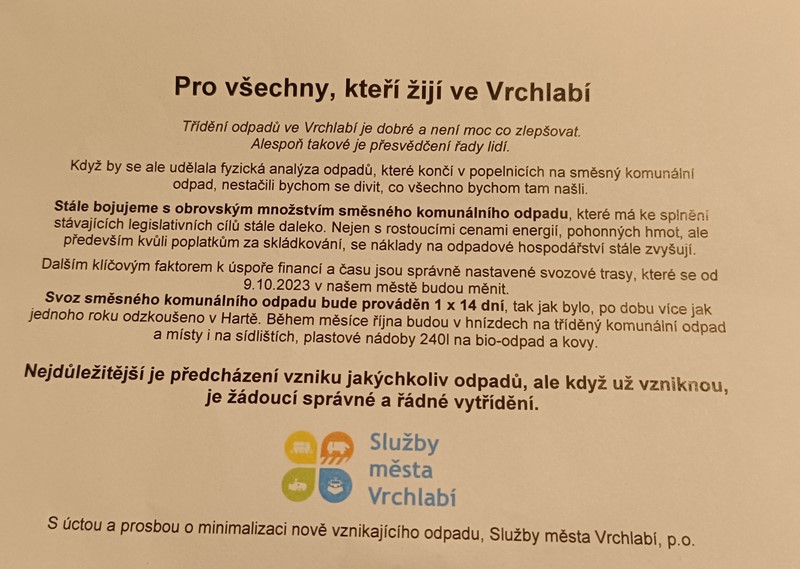 Popelářská auta proto budou vyvážet popelnice jednou za dva týdny, nicméně současná cena za svoz odpadu – tedy 650 korun na osobu za rok – se měnit nebude. Navíc se proslýchá, že by zastupitelé mohli tuto cenu s platností od příštího roku ještě zvýšit. Služby města ve svém oznámení obyvatele upozorňují, že od 9. října dojde ke změně svozových tras. Bližší informace o tom, jak tyto změny budou vypadat, však tiskovina neobsahuje.