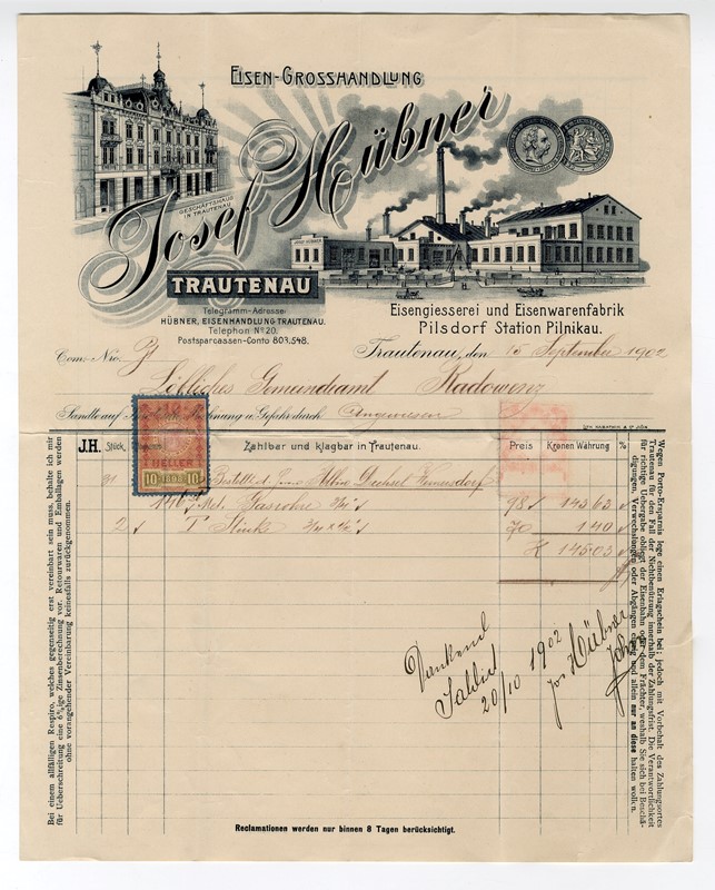Dopisní papír s vedutou firmy Josef Hübner, velkoobchod železem (v Trutnově naproti Máji) a slévárna železa v Pilsdorfu (Pilníkově) z přelomu 19. a 20. století se získanými medailemi za své výrobky. Firma byla založena v Trutnově Josefem Hübnerem roku 1870 a roku 1898 ji rozšířil o slévárnu v nedalekém Pilsdorfu, obci, která byla za 1. republiky sloučena s městem Pilníkov. Slévárna v nedalekém Pilníkově byla v provozu do roku 2009, kdy upadla do insolvence.