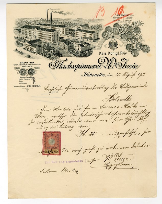 Dopisní papír s vedutou vrchlabské c. k. privilegované přádelny lnu W. Jerie z konce 19. století, včetně medailí za své výrobky. Jerie zakoupil v roce 1857 bývalou papírnu a přestavěl ji na přádelnu lnu. Za 2. světové války zde německá firma Stolzenberg provozovala zbrojní výrobu. Dnes objekt slouží vrchlabské firmě Labit.