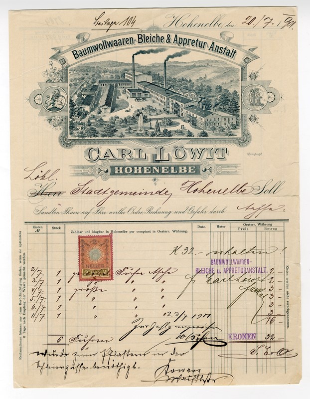 Dopisní papír bělidla a úpravny bavlněného zboží Karla Löwita z Vrchlabí někdy z konce 19. století. Na tomto místě dnes stojí firma Kablo Vrchlabí, která letos oslavila 100 let existence.