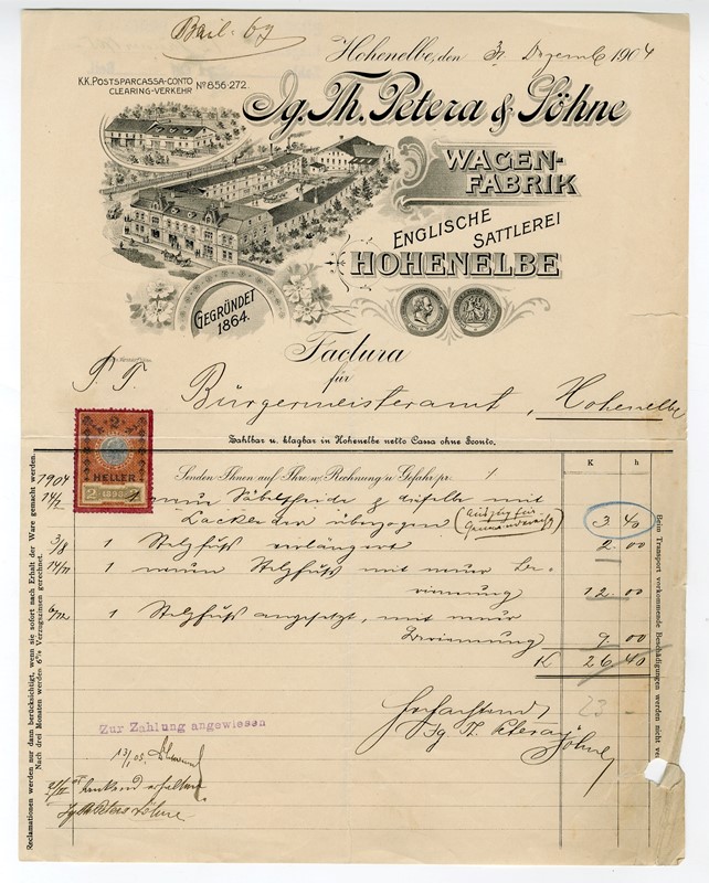 Dopisní papír s vedutou sídla firmy Ignác Theodor Petera na tzv. Kozím plácku ve Vrchlabí z konce 19. století, včetně ocenění firmy. Firma Petera se zabývala podle rodinné tradice od roku 1864 sedlářstvím a později výrobou karoserií a je předchůdcem vrchlabské Škodovky.