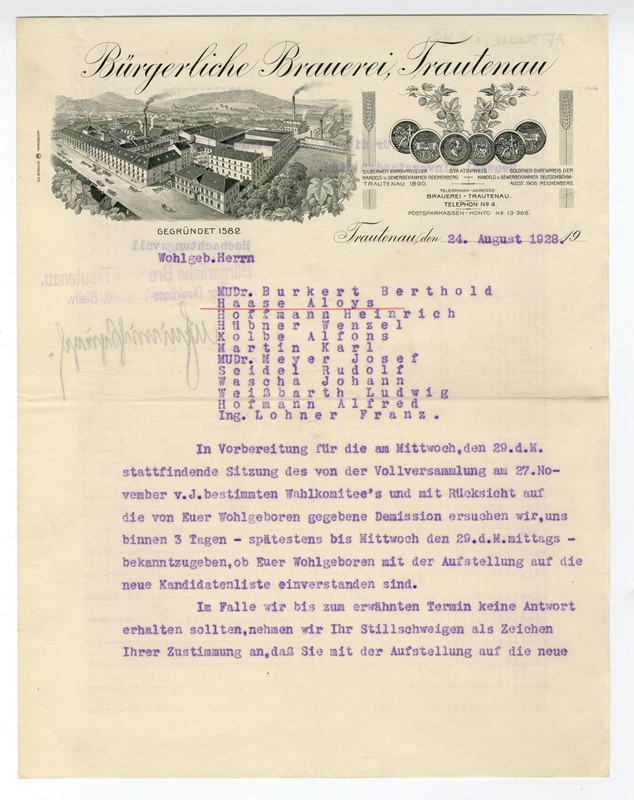 Dopisní papír s vedutou trutnovského pivovaru někdy z počátku 20. století zobrazuje nejen samotný pivovar, ale také nasbíraná ocenění za vyráběné pivo z let 1890 a 1906. Vaření piva v Trutnově souvisí s právem várečným, uděleným roku 1340 králem Janem Lucemburským. Ještě v 19. století existovaly v Trutnově dva pivovary, jeden ve Školní ulici, který nebyl po požáru města roku 1861 obnoven, a dolní pivovar, který je v provozu dodnes a vyrábí známé pivo značky Krakonoš.