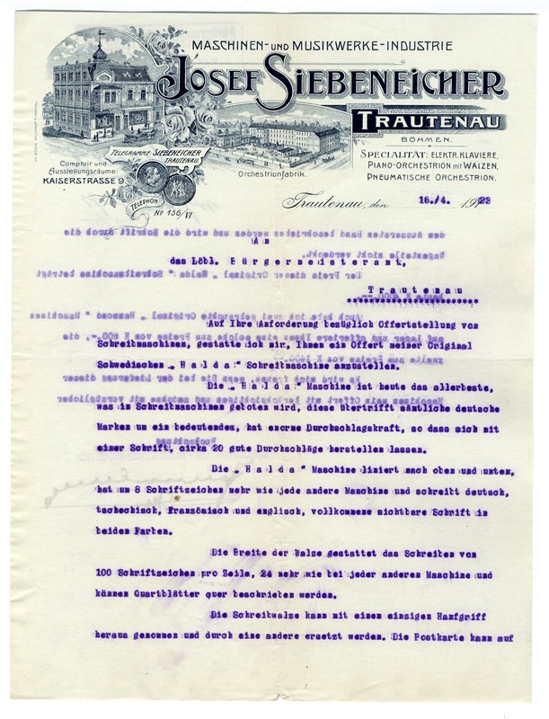 Dopisní papír s vedutou firmy Josef Siebeneicher, strojní výroba hudebních nástrojů v Trutnově z počátku 20. století, včetně ocenění za výrobky. Veduta zobrazuje dům v trutnovské Palackého ulici, který stojí dodnes. Počátky firmy spadají do roku 1908. Zabývala se výrobou samohrajících orchestrionů na mince nebo výrobou pianoorchestrionů. Jako specialitu nabízela výrobu elektrických klavírů nebo pneumatických orchestrionů.