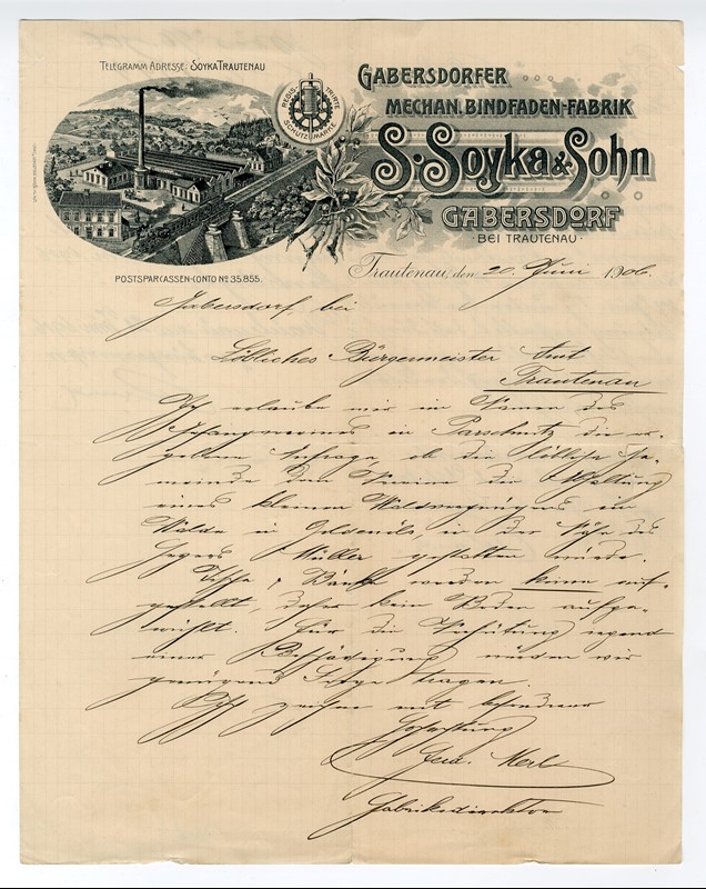 Dopisní papír s vedutou libečské mechanické továrny na stuhy S. Soyka z konce 19. století s vyobrazením ochranné známky firmy. Firma vznikla již v roce 1890 a libečskou továrnu postavila v letech 1894/95. Pracovalo zde až 100 lidí. Polorozbořený tovární objekt zde stojí dodnes.