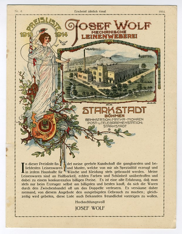 Kolorovaný ceník firmy Josef Wolf ze Stárkova (pozdější závod Texlen 18 Stárkov) z let 1913/14 s vedutou firmy. Dnes zde firma Frolen pokračuje ve výrobě smyčkového zboží.