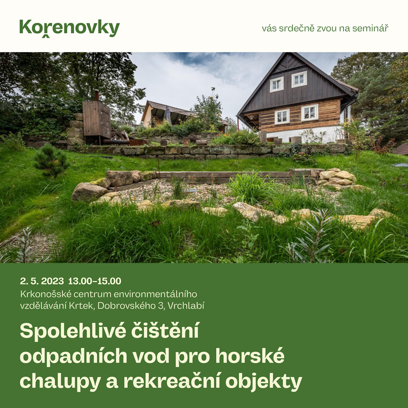V úterý 2. května bude od 13 do 15 hodin Krkonošské centrum environmentálního vzdělávání Krtek ve Vrchlabí hostit seminář „Spolehlivé čištění odpadních vod pro horské chalupy a rekreační objekty“, který pořádá společnost Kořenovky.cz.