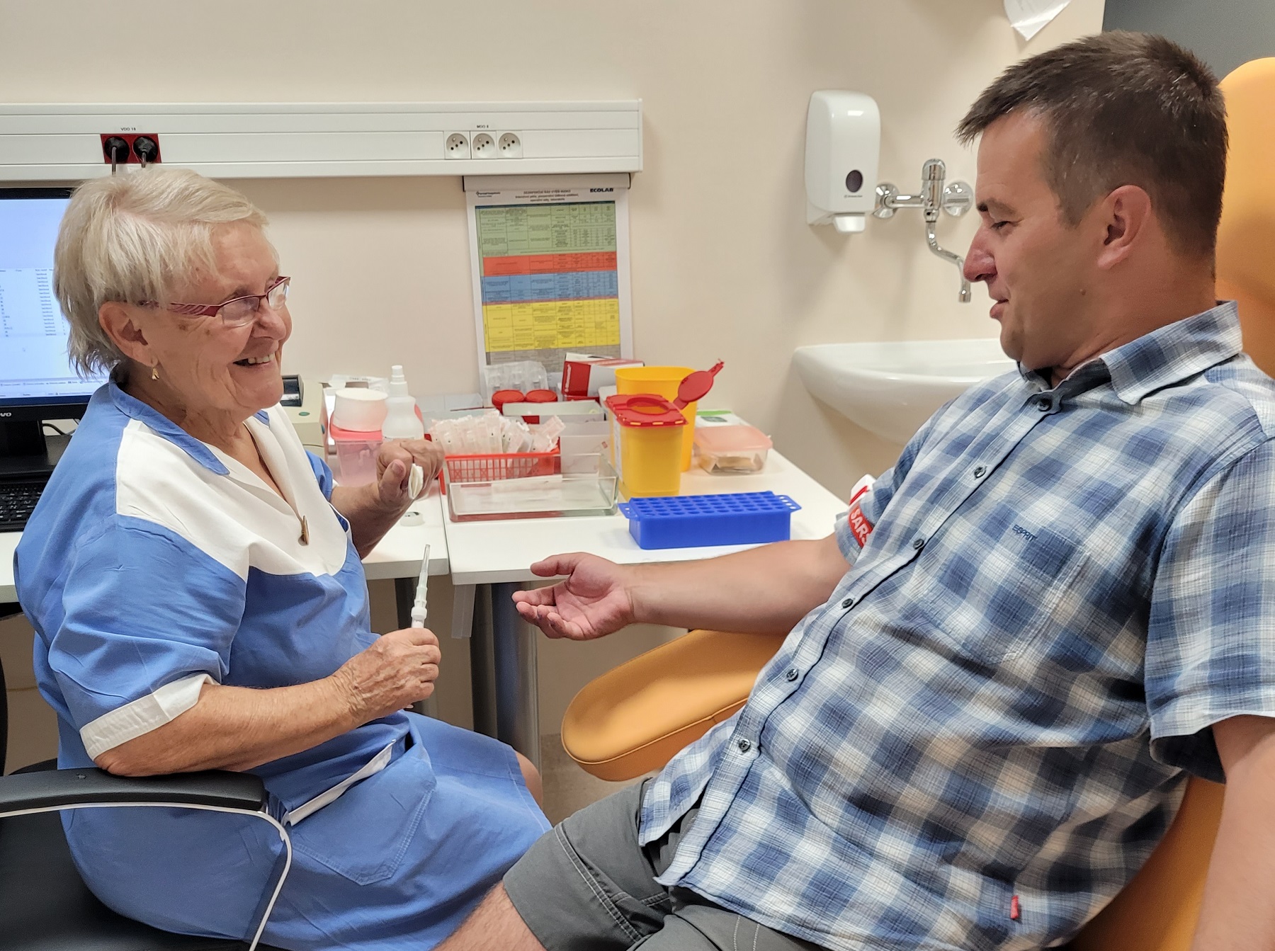 Když udělá potřebnou administrativu, jde se na věc. Drahuška prohlédne pacientovi předloktí a vybere si ruku, z níž bude krev odebírat. Poté paži zaškrtí, potře dezinfekcí a šup. V mžiku máte jehlu v paži a do přikládaných zkumavek vám vytéká rudá tělní tekutina. Než se vzpamatujete, je hotovo. Na Drahušce je vidět její mnohaletá praxe a precizní postup, ze kterého se stala rutina. V nemocnici pracuje již od roku 1971 a pacientům tak slouží přes půl století. Denně zde odebere krev zhruba 30 až 40 pacientům, kteří sem chodí samozřejmě nalačno v čase mezi 6. hodinou ranní až 10. hodinou dopolední. „Ještě polepím zkumavky vytisknutými štítky a pošlu to o dům dál,“ říká s úsměvem na rozloučenou.
